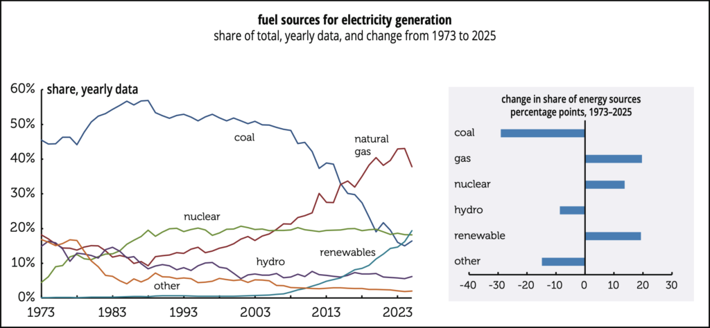 These are not transient developments. In the 2020 edition of its World Energy Outlook the International Energy Agency (IEA) said that solar power “is now the cheapest source of electricity in history.” Wind’s advantage isn’t as dramatic, but it’s real—and utilities are acting on these cost comparisons. Again, according to the IEA, this its Global Energy Review 2025 (which has replaced the World Energy Outlook), renewables “made up almost three-quarters of the overall increase in power generation” in 2024, with solar in the lead. Add nuclear and hydro and you approach four-fifths. Fossil fuels accounted for almost all of the remaining fifth, well below their existing share.