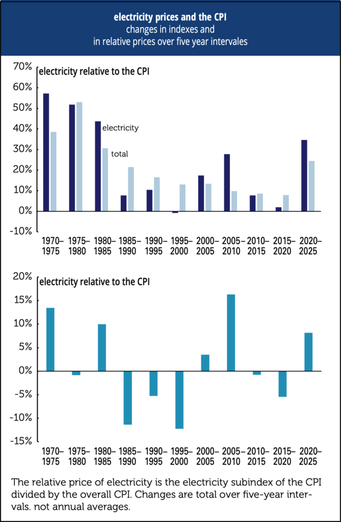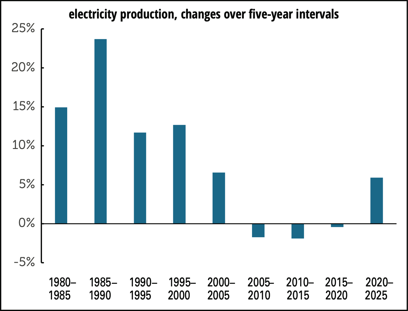 Reflecting on these numbers prompted us to look over some stats on electricity. Nationally, as the graph below shows, electricity production, as measured by the Federal Reserve’s industrial production series, was, like Virginia’s, virtually unchanged between 2006 and 2020—and 2024, for that matter. (We’re using five-year intervals in the graphs because yearly numbers are quite volatile.) It’s begun to rise—up around 2% a year since 2023, compare to an average annual rate of 0.1% between 2000 and 2023, and if the projections are to be believed it’s only the beginning.