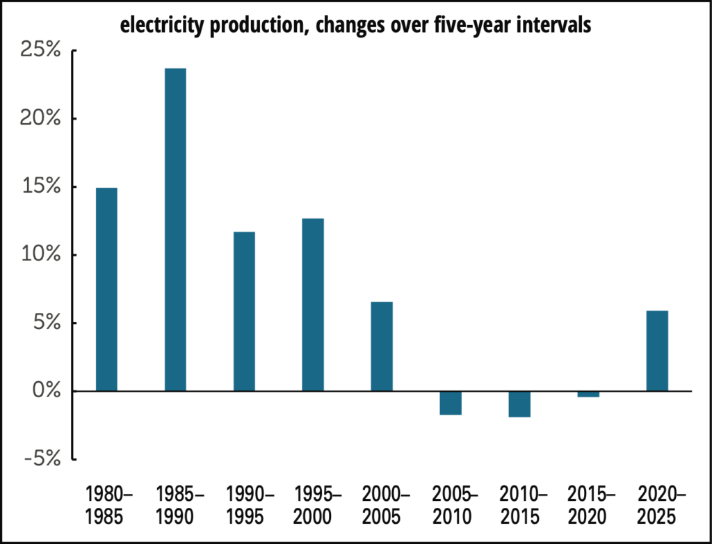 Reflecting on these numbers prompted us to look over some stats on electricity. Nationally, as the graph below shows, electricity production, as measured by the Federal Reserve’s industrial production series, was, like Virginia’s, virtually unchanged between 2006 and 2020—and 2024, for that matter. (We’re using five-year intervals in the graphs because yearly numbers are quite volatile.) It’s begun to rise—up around 2% a year since 2023, compare to an average annual rate of 0.1% between 2000 and 2023, and if the projections are to be believed it’s only the beginning.
